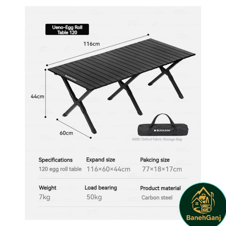 در حالت بازشده، این میز با ابعاد ۴۴ × ۶۰ × ۱۱۶ سانتیمتر فضای کافی برای فعالیتهای روزمره مانند غذا خوردن، نوشتن، کار با لپتاپ یا حتی آشپزی در فضای باز را فراهم میکند.