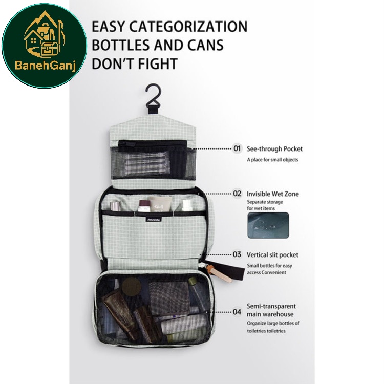 اهرم آویز پلاستیکی و دستگیره حمل: این کیف دارای یک اهرم آویز پلاستیکی است که به شما این امکان را میدهد که کیف را به راحتی در هر جایی آویزان کنید، مثلاً در حمام یا سرویس بهداشتی. این ویژگی به شما کمک میکند تا از فضای محدود خود بهترین استفاده را ببرید و کیف شما همیشه در دسترس باشد. علاوه بر این، کیف مجهز به دستگیره حمل است که حمل آن را بسیار آسانتر میکند. با استفاده از این دستگیره میتوانید کیف را به راحتی جابجا کرده و در صورت نیاز، آن را به سرعت به هر جایی منتقل کنید.