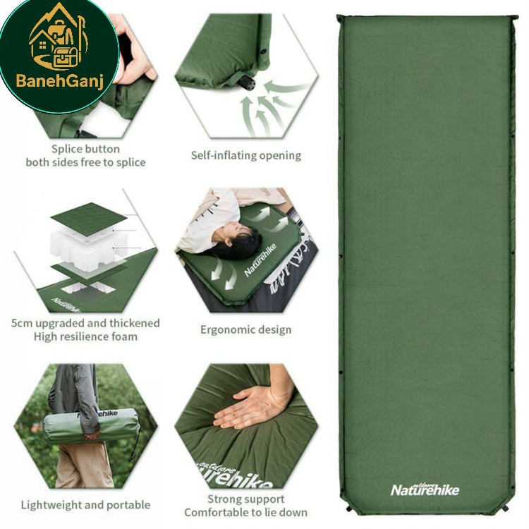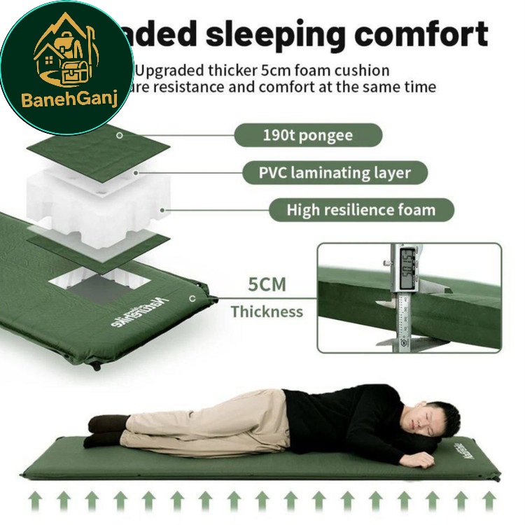 این مدل از برند Naturehike (نیچرهایک)، با اندازههای استاندارد ۲۰۰ × ۶۳ × ۵ سانتیمتر در حالت باز و ضخامت ۵ سانتیمتر، فضایی مناسب برای خواب یک نفر را فراهم میکند. سطح زیرانداز از پارچه Pongee با پوشش مقاوم و لایه داخلی فوم مخصوص (190T sponge) ساخته شده که علاوه بر سبک بودن، مقاومت خوبی در برابر سایش و نفوذ رطوبت دارد.