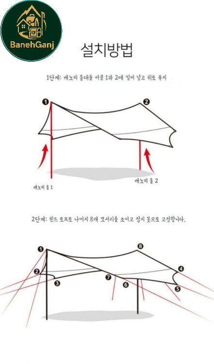 برای نصب و استفاده آسانتر، همراه این سایبان ۱۰ عدد میخ شبرنگ ۲۰ سانتیمتری، ۱۰ عدد طناب مقاوم (۴ عدد به طول ۲۸۰ سانتیمتر و ۶ عدد به طول ۲۲۰ سانتیمتر)، و کاور مخصوص حمل ارائه میشود. وجود شبرنگ روی میخها باعث میشود در شب بهراحتی قابل تشخیص باشند و از برخورد ناخواسته جلوگیری شود.