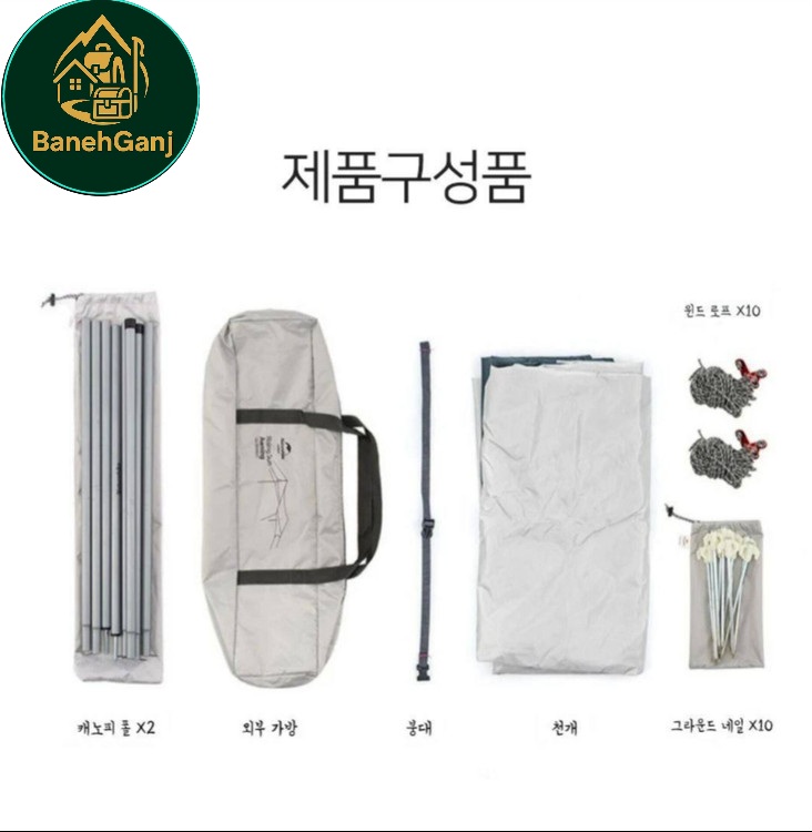 کاور مخصوص حمل ، ده عدد میخ شبرنگ ۲۰ سانتیمتری ، ۱۰ عدد طناب ، ۲ عدد نیله پشتیبان