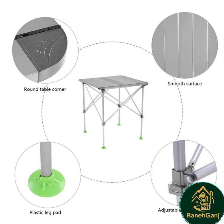 پایهها نیز از آلومینیوم مستحکم با ساختار تقویتشده تولید شدهاند که ثبات میز را حتی در سطوح ناهموار تضمین میکند.