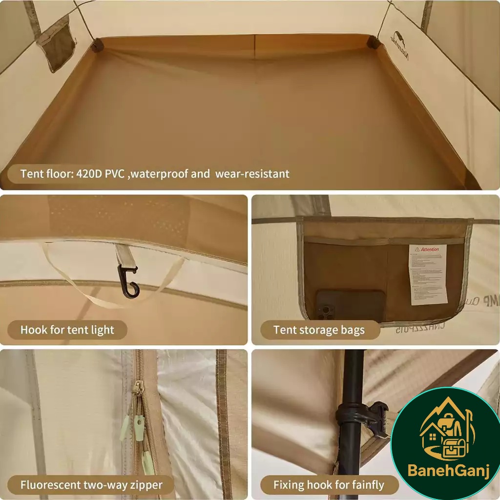 چادر 6 نفره نیچرهایک Cloud Vessel مدل CNH22ZP015 با ابعاد باز 600 × 230 × 200 سانتیمتر، فضای کافی برای شش نفر دارد و وزن 22 کیلوگرمی آن، حمل و جابهجایی را برای گروههای طبیعتگردی آسان میکند. جنس پوشش چادر از پلیاستر 210D با لایه نقرهای نازک است که علاوه بر مقاومت، قابلیت انعکاس نور و محافظت در برابر اشعه UV دارد. شاخص ضدآب PU 2000mm و طراحی مقاوم در برابر باد، امنیت و آسایش شما را حتی در شرایط جوی نامساعد تضمین میکند.
