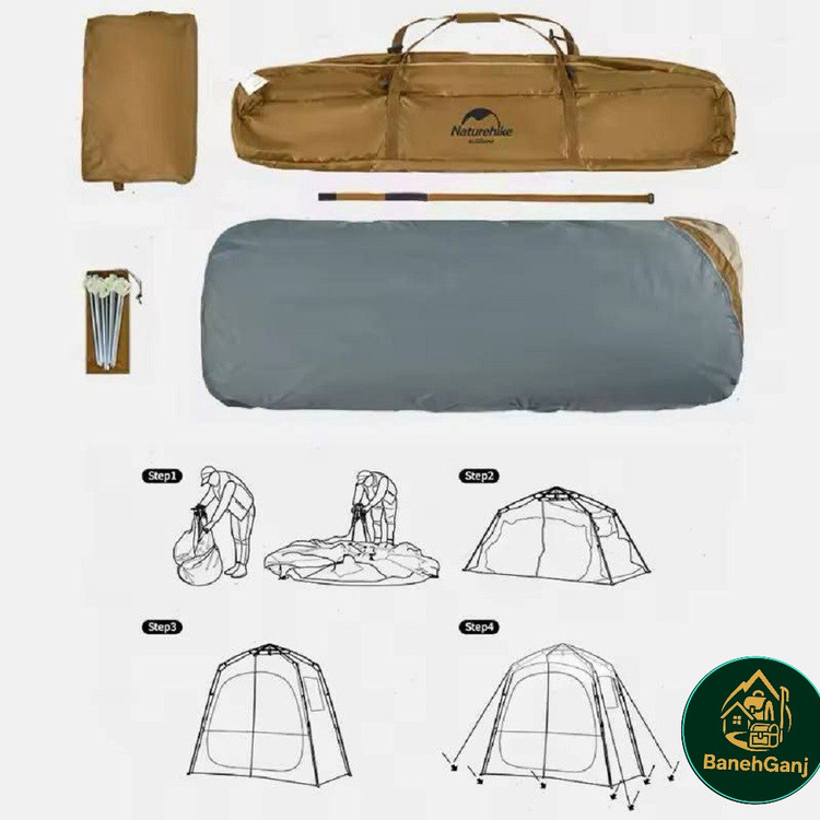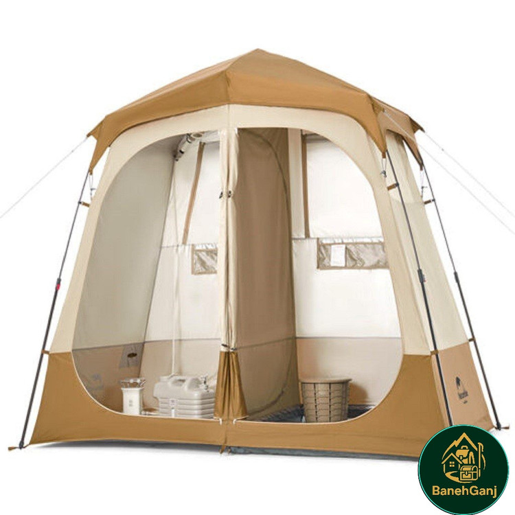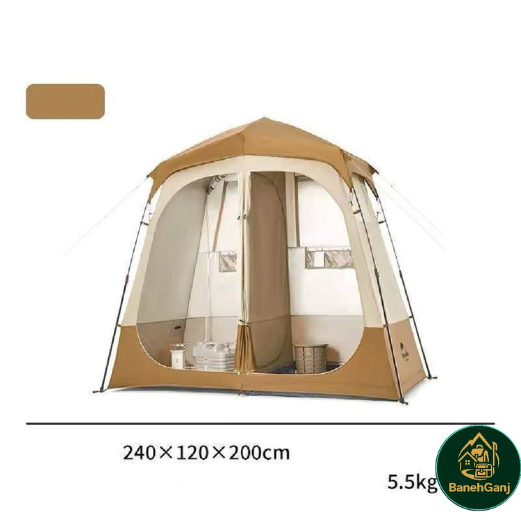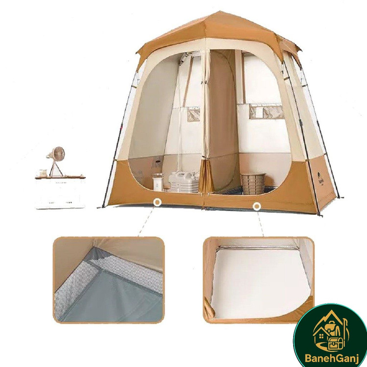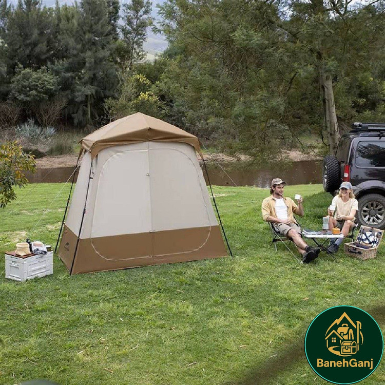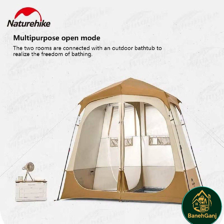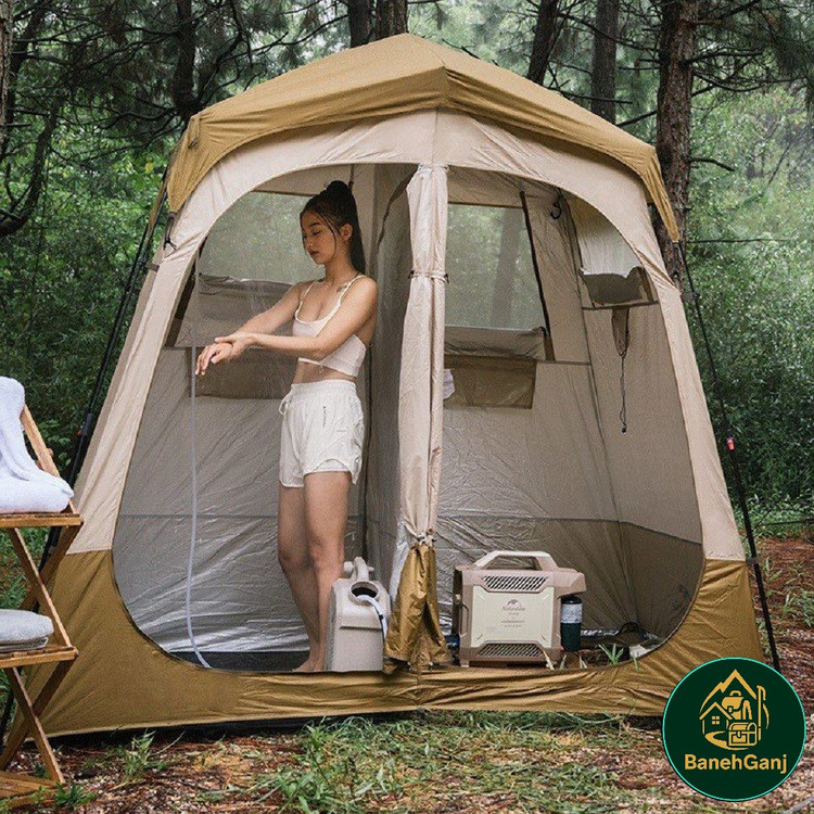 چادر حمام اتوماتیک دو کابین نیچرهایک مدل NH22ZP006 چادری با طراحی و ساخت فوق العاده می باشد که شرایط استحمام را در سفر برای شما راحت می کند. این چادر با تکنولوژی اتوماتیک تنها در حدود ۱ دقیقه برپا میشود و دارای دو کابین مجزا با ابعاد 120×120×200 سانتیمتر است که امکان تفکیک فضای خشک و تر را فراهم میکند. ابعاد کلی چادر 200×120×240 سانتیمتر بوده و با وزن تقریبی 5.5 کیلوگرم، تعادل مناسبی میان استحکام و قابلیت حمل ایجاد کرده است. این مدل قابلیت استفاده همزمان بهعنوان حمام و سرویس بهداشتی یا حمام و رختکن را دارد و هنگام استحمام در طبیعت، محیطی گرم، محفوظ و مقاوم در برابر باد فراهم میکند.