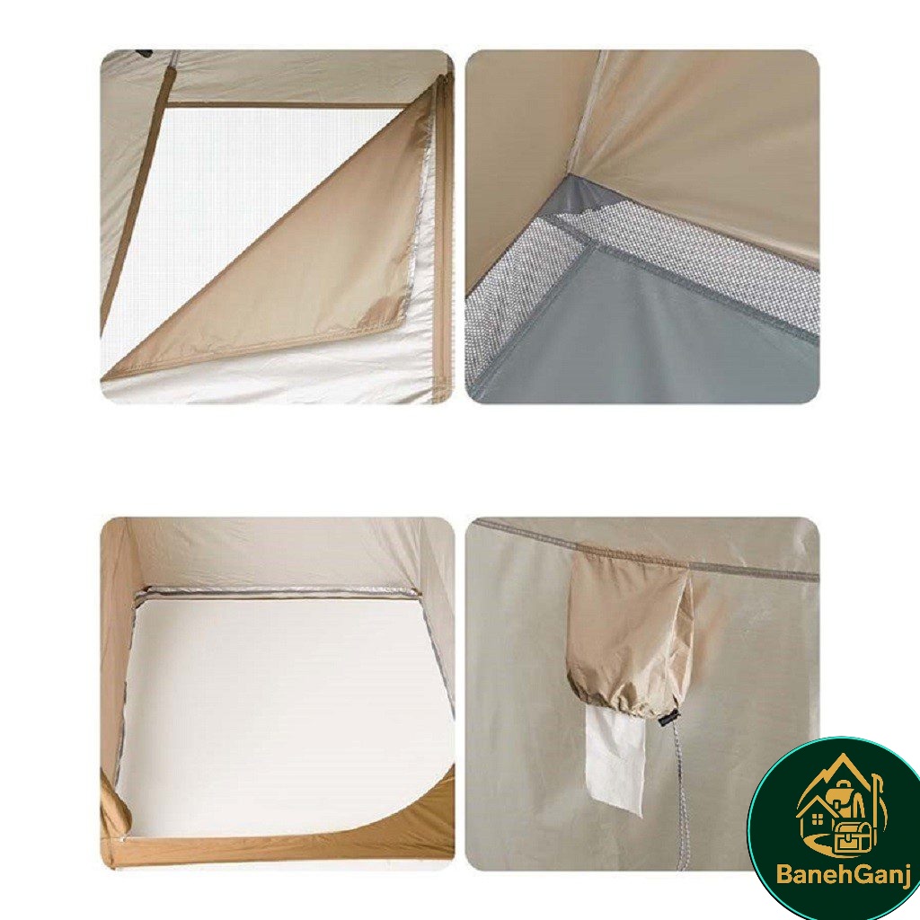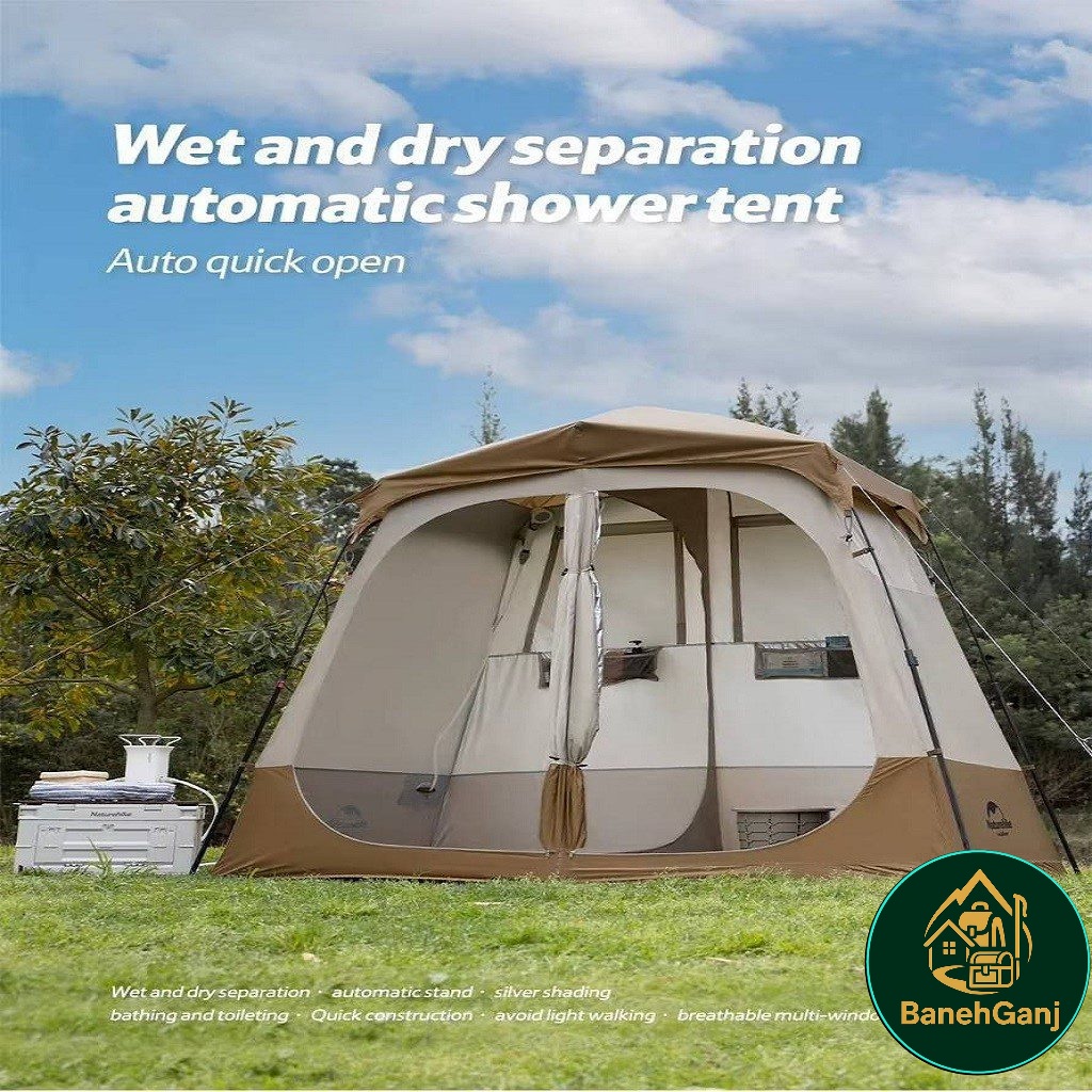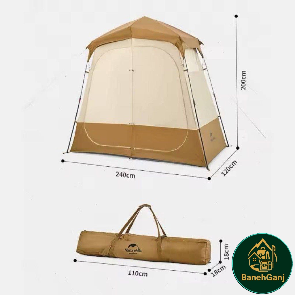 چادر حمام اتوماتیک دو کابین نیچرهایک مدل NH22ZP006 چادری با طراحی و ساخت فوق العاده می باشد که شرایط استحمام را در سفر برای شما راحت می کند. این چادر با تکنولوژی اتوماتیک تنها در حدود ۱ دقیقه برپا میشود و دارای دو کابین مجزا با ابعاد 120×120×200 سانتیمتر است که امکان تفکیک فضای خشک و تر را فراهم میکند. ابعاد کلی چادر 200×120×240 سانتیمتر بوده و با وزن تقریبی 5.5 کیلوگرم، تعادل مناسبی میان استحکام و قابلیت حمل ایجاد کرده است. این مدل قابلیت استفاده همزمان بهعنوان حمام و سرویس بهداشتی یا حمام و رختکن را دارد و هنگام استحمام در طبیعت، محیطی گرم، محفوظ و مقاوم در برابر باد فراهم میکند.