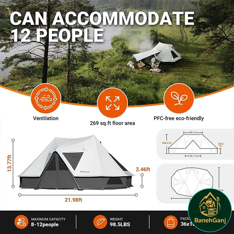 چادر کینگ کمپ مدل KT2401_GREY ابعادی بزرگ و جادار دارد که فضای کافی برای استراحت ۱۲ نفر فراهم میکند. طول، عرض و ارتفاع چادر به گونهای طراحی شده که امکان حرکت راحت داخل آن وجود دارد و حضور گروههای بزرگ یا خانوادگی را بهراحتی پشتیبانی میکند. این چادر دو کابین خواب جداگانه دارد که فضای خصوصی بیشتری در اختیار افراد قرار میدهد.