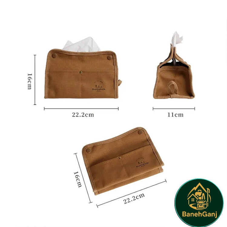 بدنه این جا دستمال از پارچه کنواس ساخته شده و با پوشش وکس محافظت شده است. این ترکیب باعث مقاومت بالا در برابر نفوذ آب، رطوبت و لکهها میشود. همین ویژگی باعث میشود این محصول برای استفاده در کمپ، سفر، طبیعتگردی و حتی داخل خودرو مناسب باشد. جنس پارچه علاوه بر دوام بالا، ظاهر زیبا و طبیعی به محصول داده است.