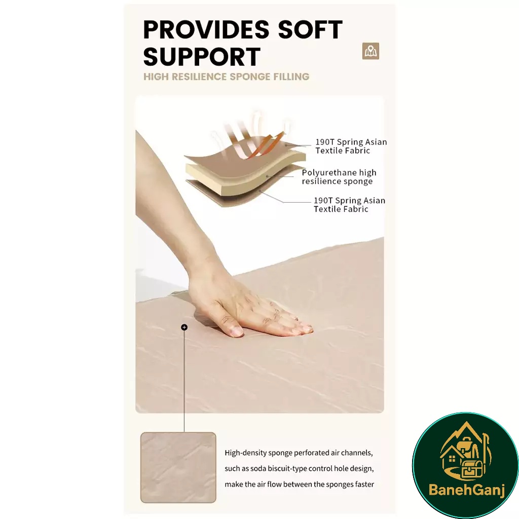 وجود بالش یکپارچه و ضخامت ۸ سانتیمتری، تجربه خواب راحتتری روی زمینهای سخت و ناهموار ایجاد میکند. اسفنج داخلی فشرده 19D با خاصیت ارتجاعی بالا، بدن را به خوبی حمایت کرده و فشار نقاط حساس بدن را کاهش میدهد.