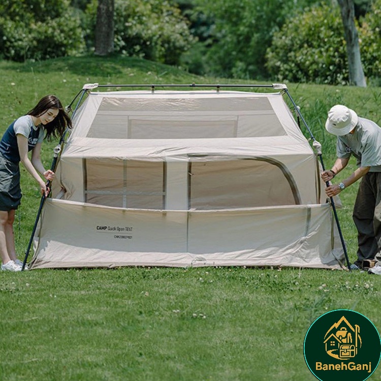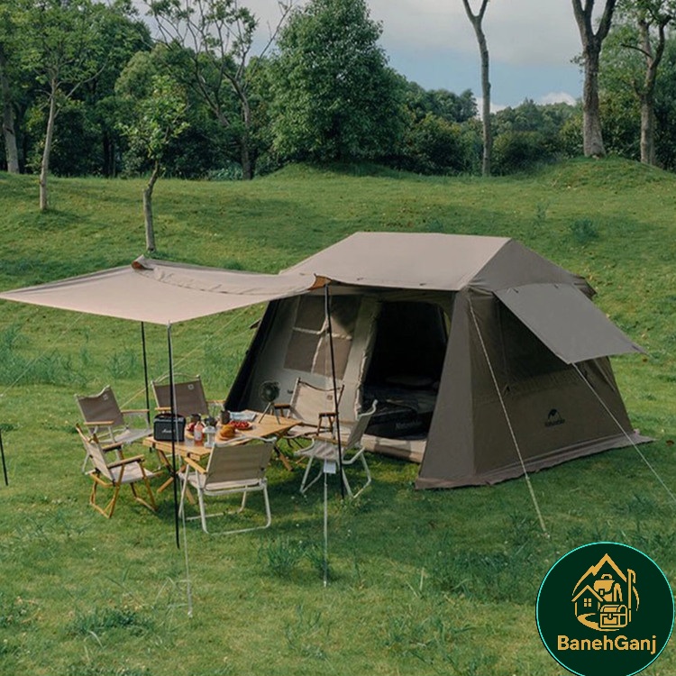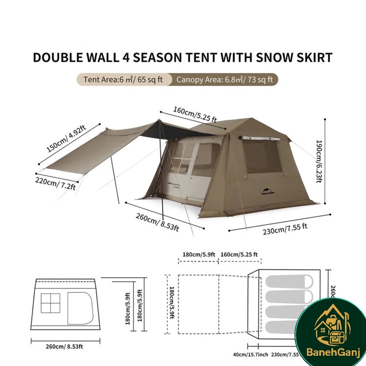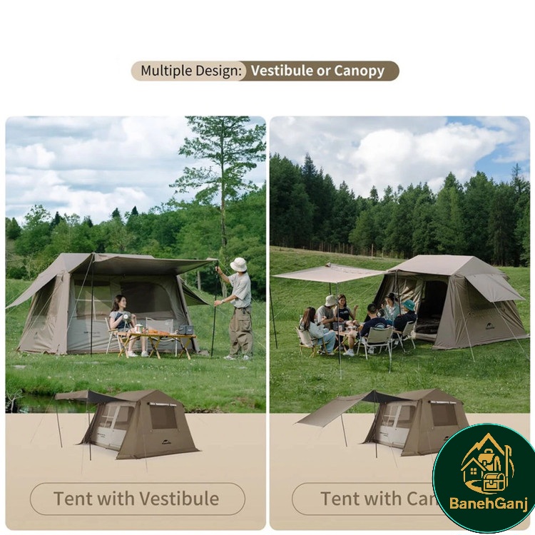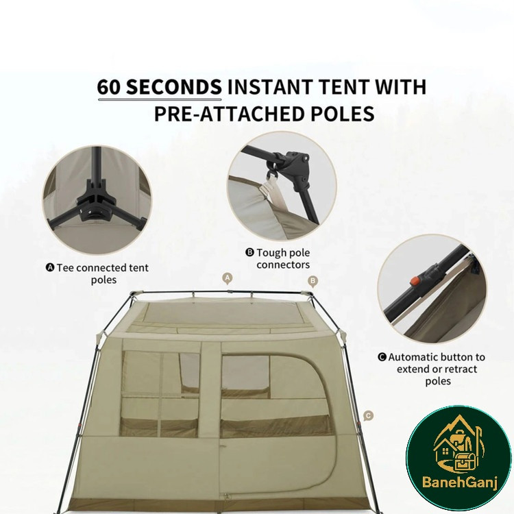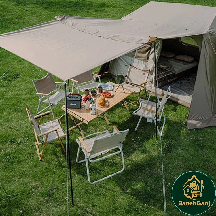 16 عدد میخ 20 سانتی متری + کیسه حمل، 8 عدد طناب 3 متری، یک عدد پارچه سایبان، 2 عدد میله سایبان 170 سانتی متری، کیسه ذخیره سازی